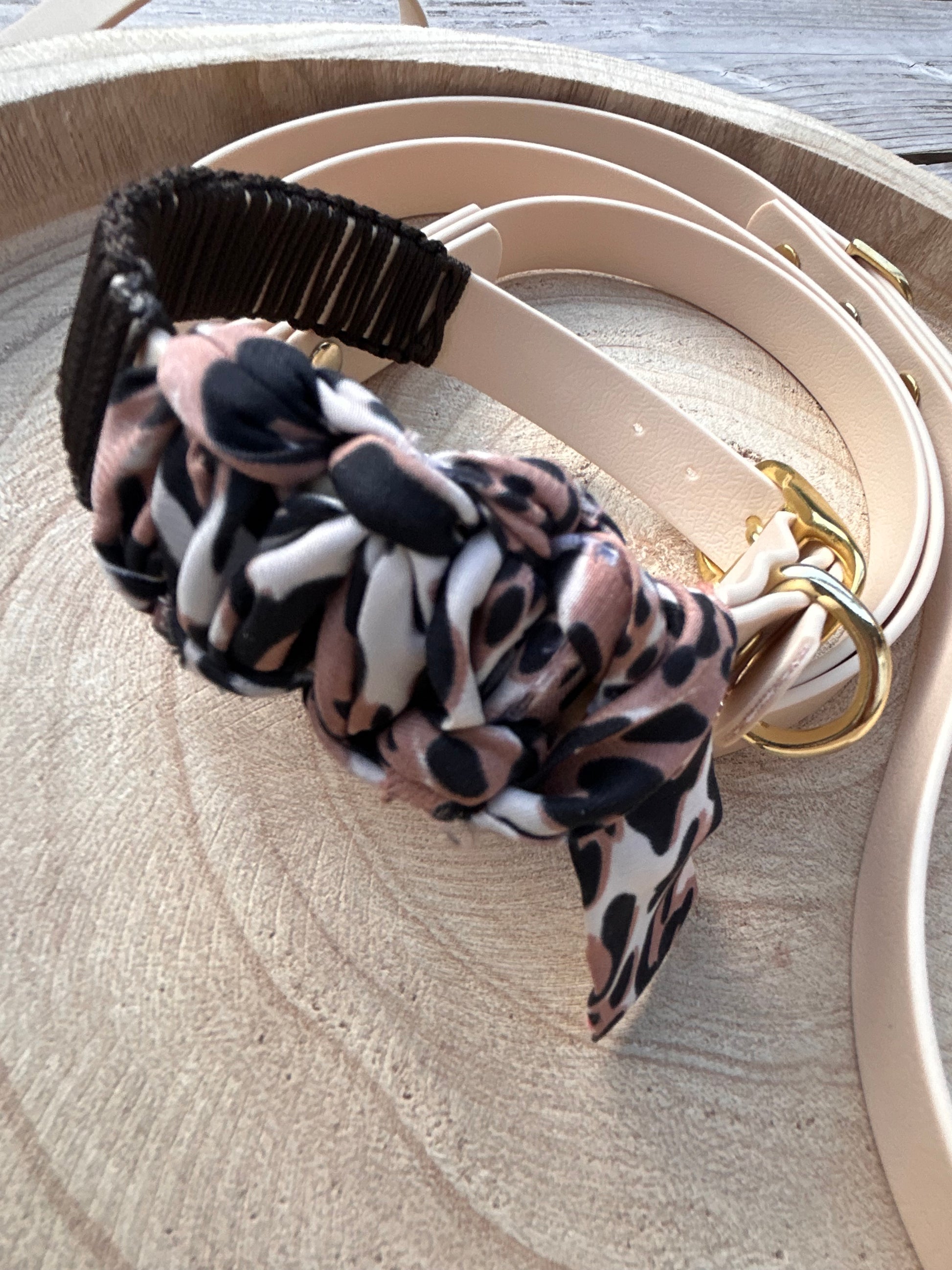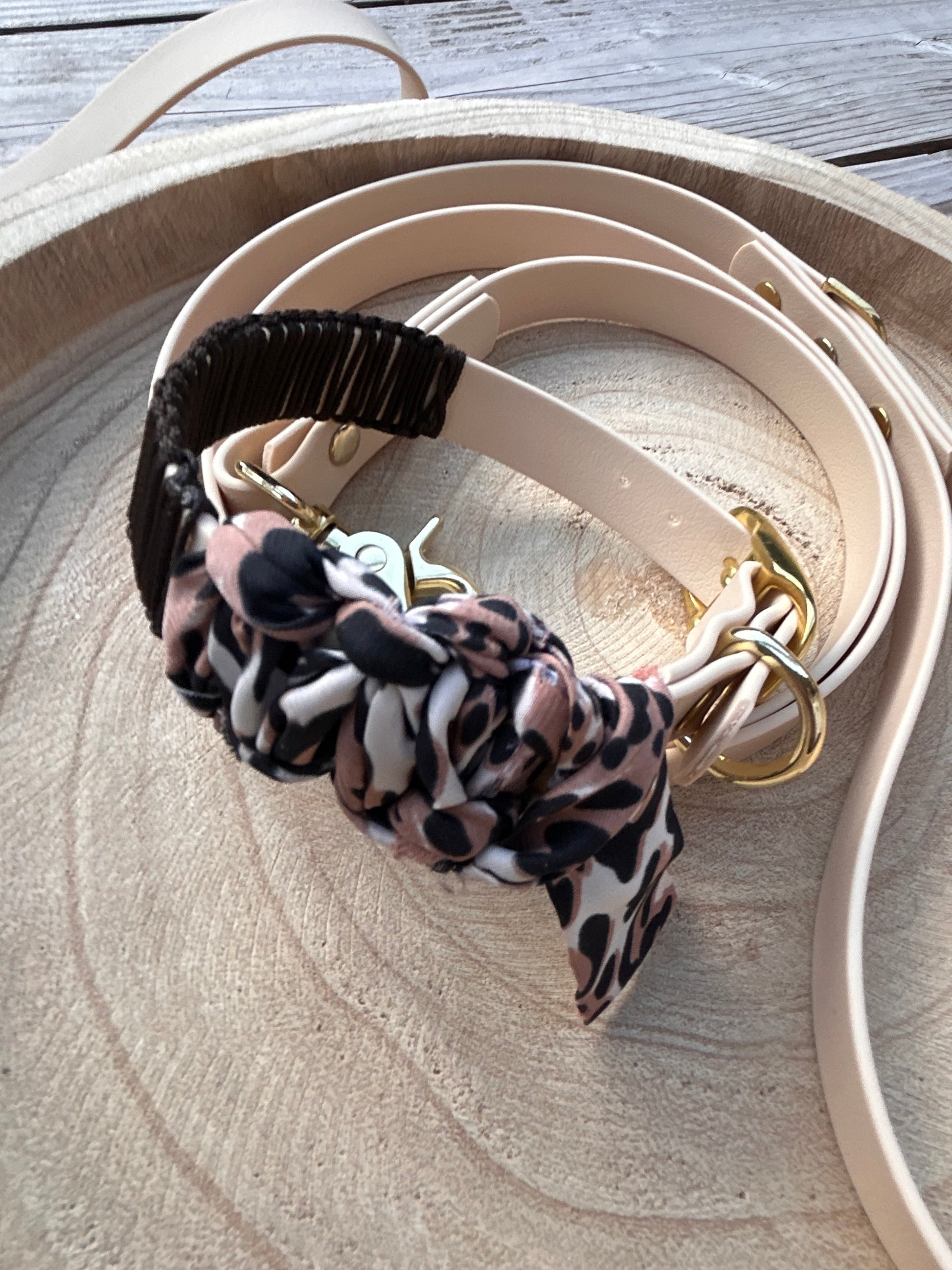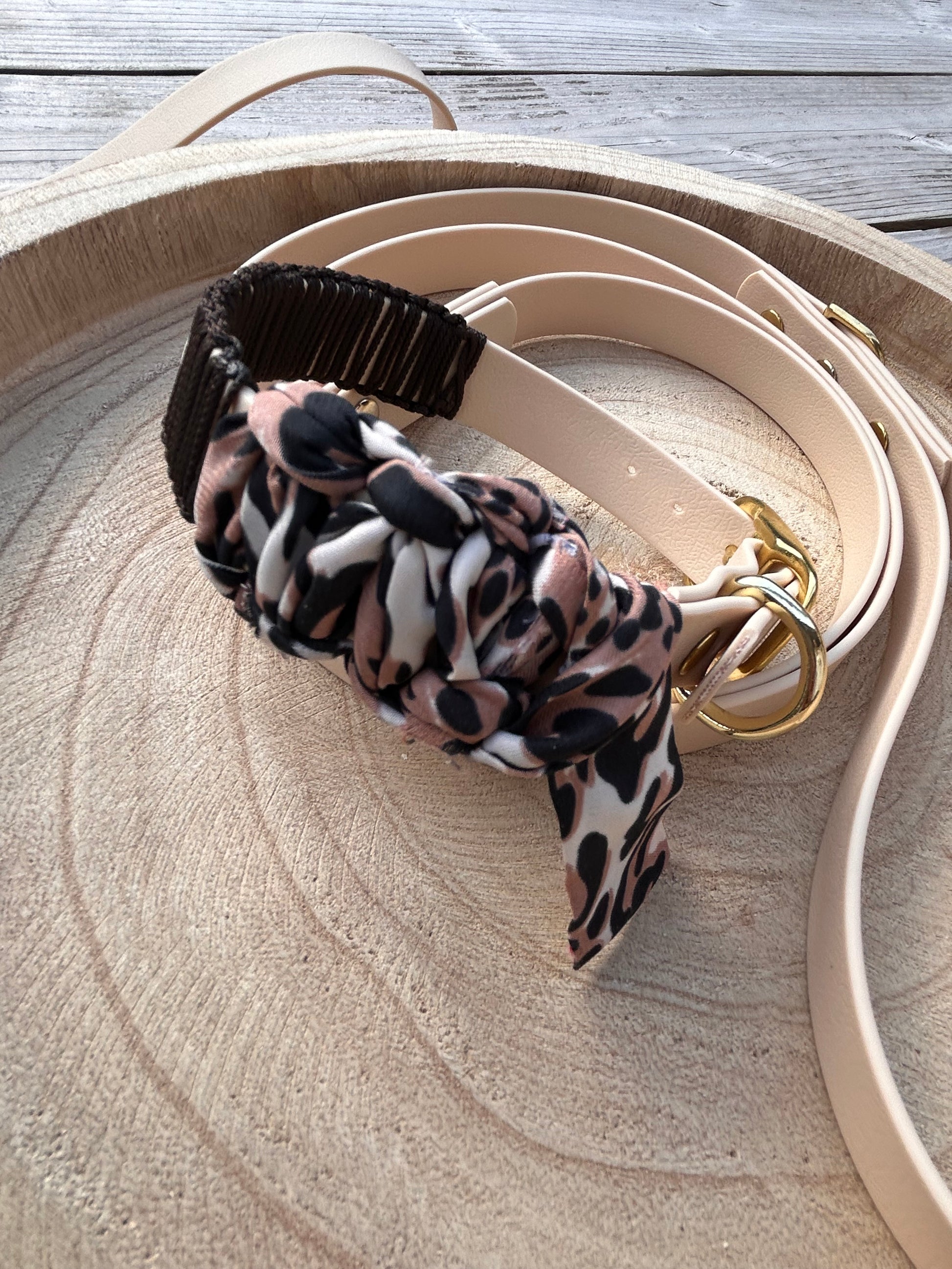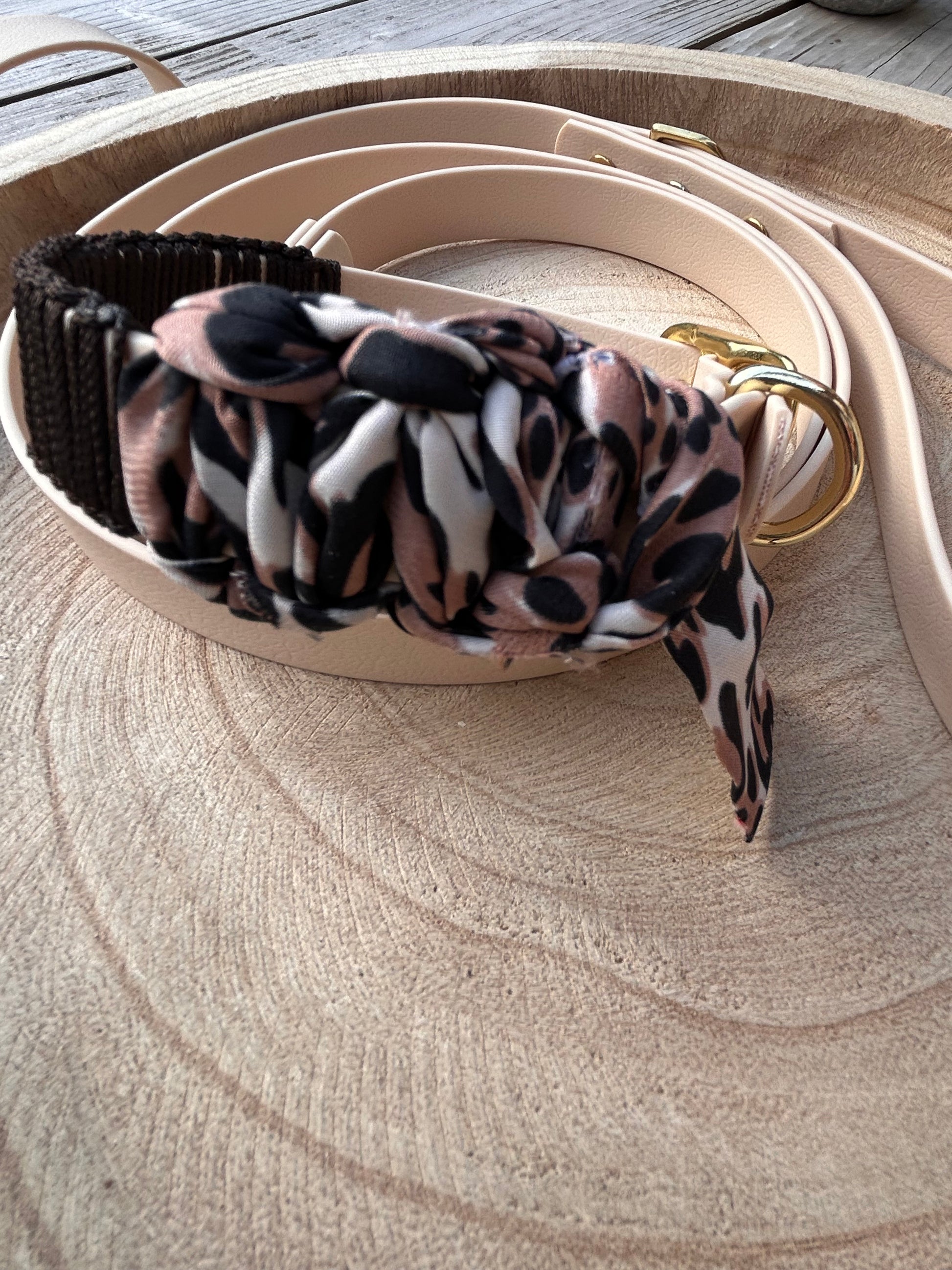 Deze handgemaakte halsband is een echte blikvanger voor jouw viervoeter. Gemaakt van soepel biothane in een zachte nude tint, met luxe gouden details voor een elegante afwerking. Het sjaaltje in panterprint geeft een chique twist – perfect voor honden met een eigen stijl.