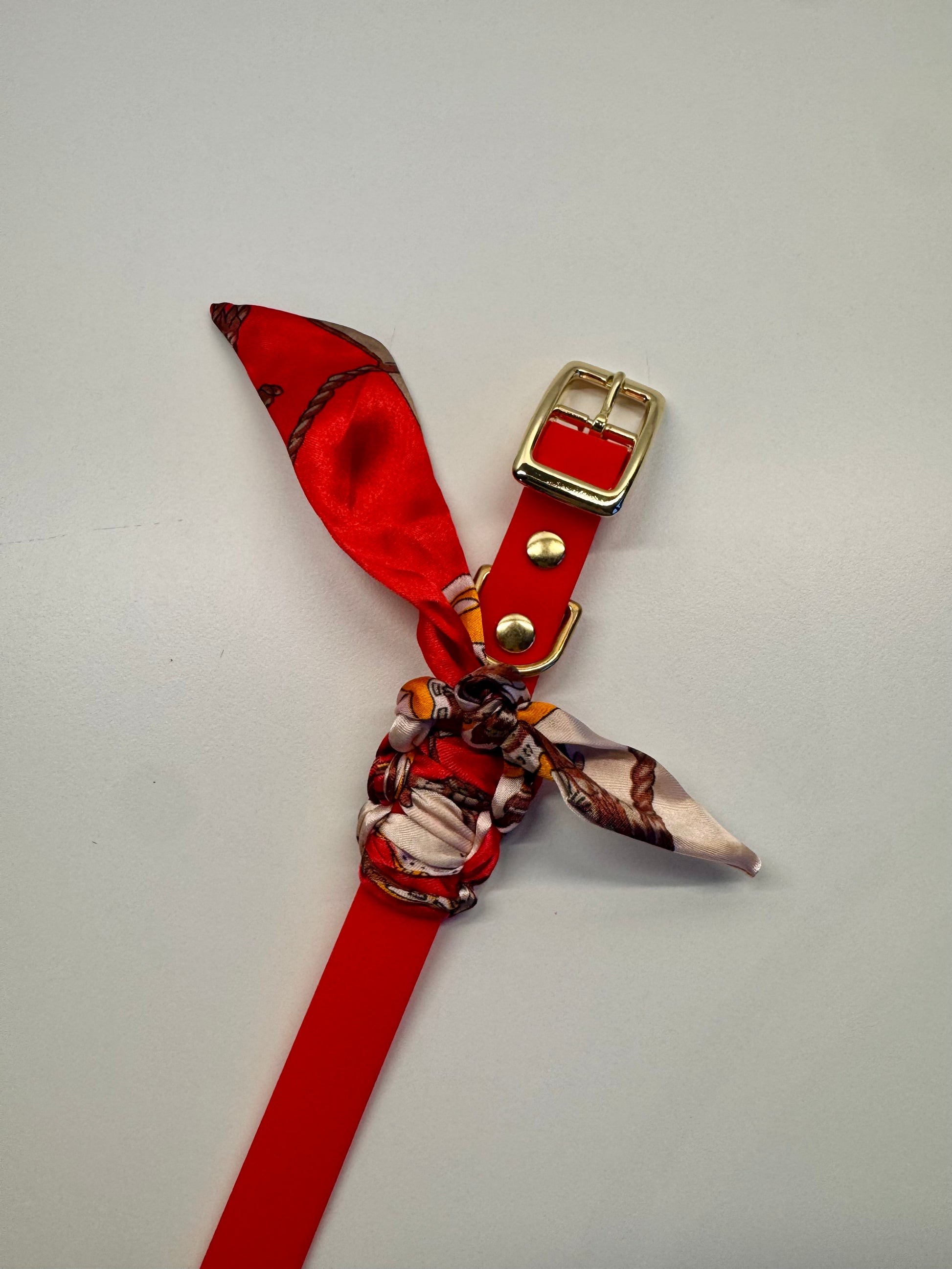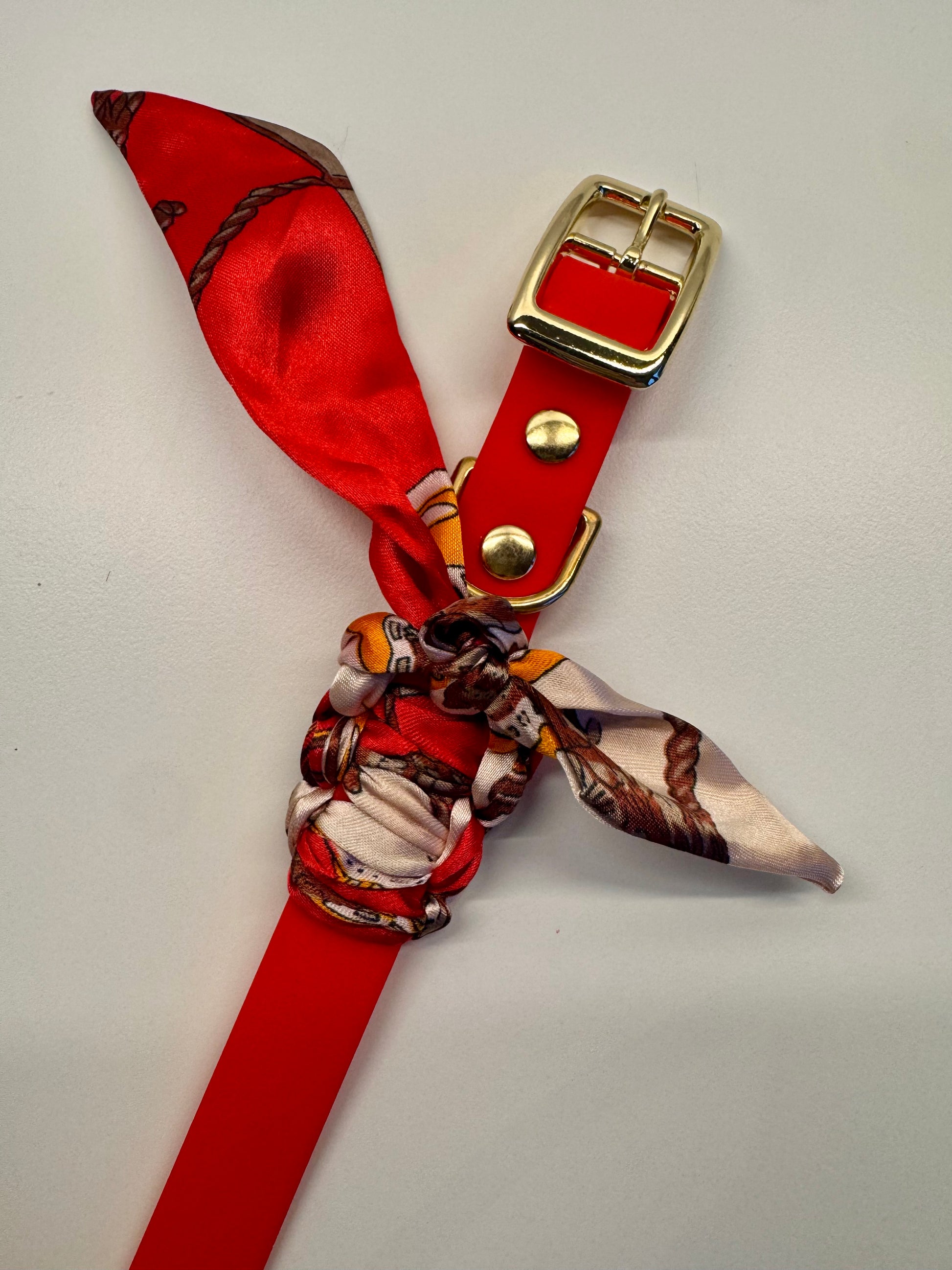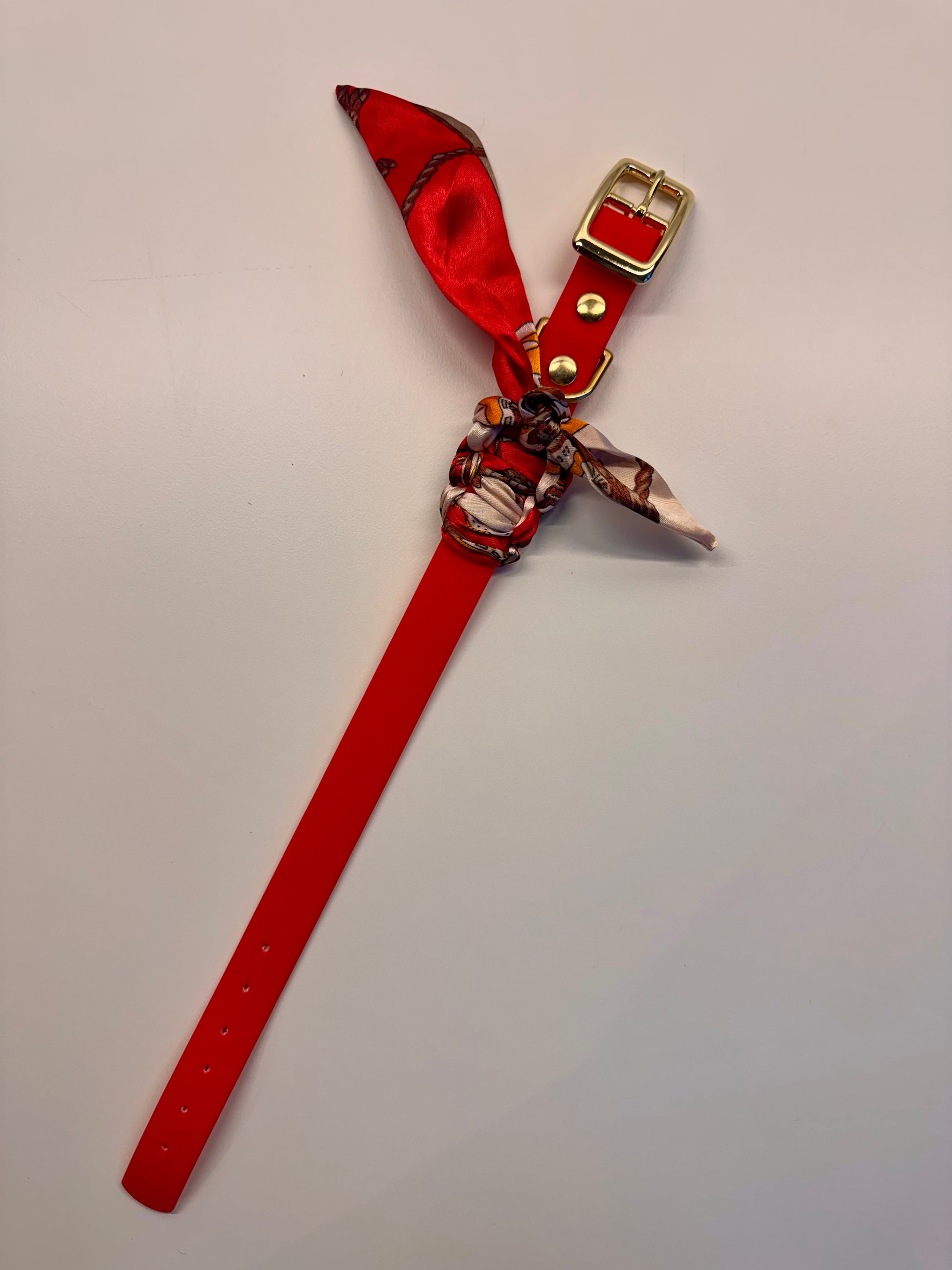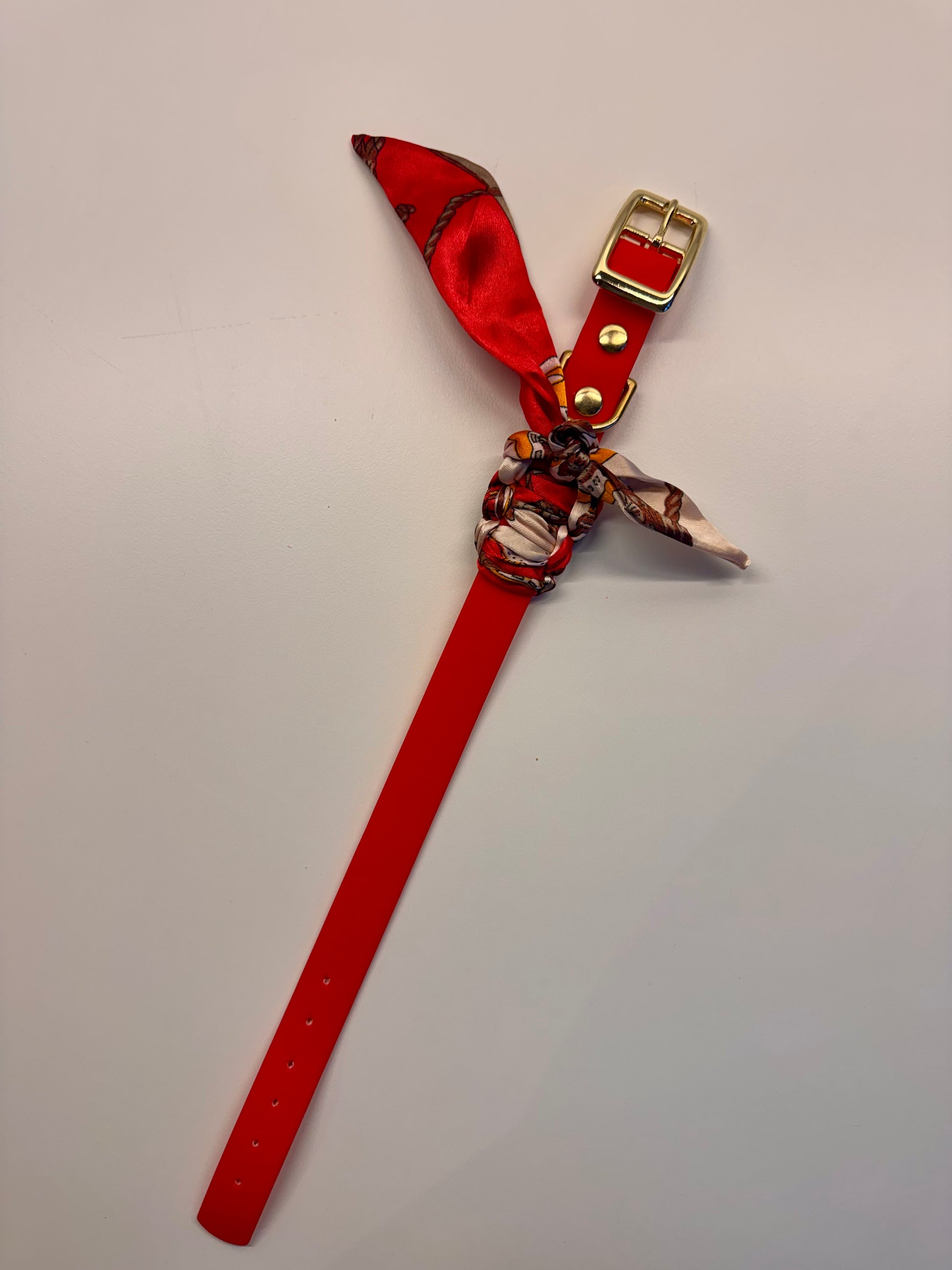 Op zoek naar een elegante en simpele hondenhalsband die opvalt? Deze handgemaakte Biothane halsband is een echte blikvanger voor jouw viervoeter. Gemaakt van hoogwaardig, soepel Biothane in een stijlvolle rode kleur afgewerkt met sjaaltje voor een exclusieve uitstraling.
