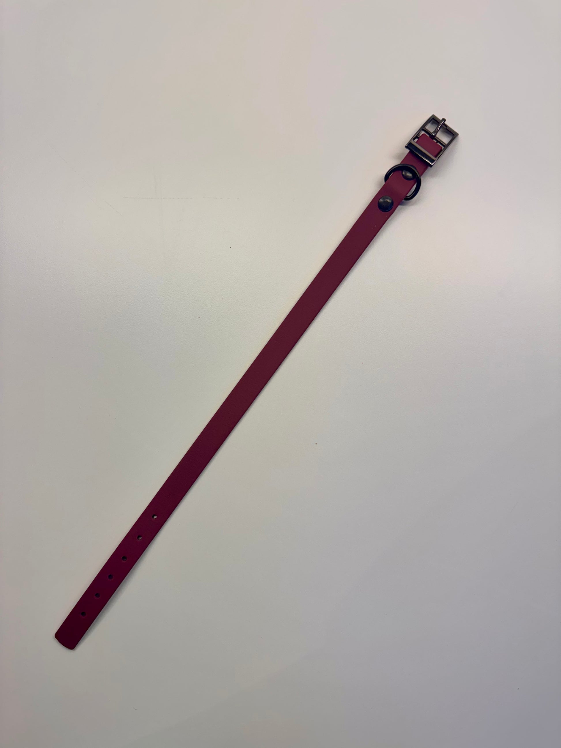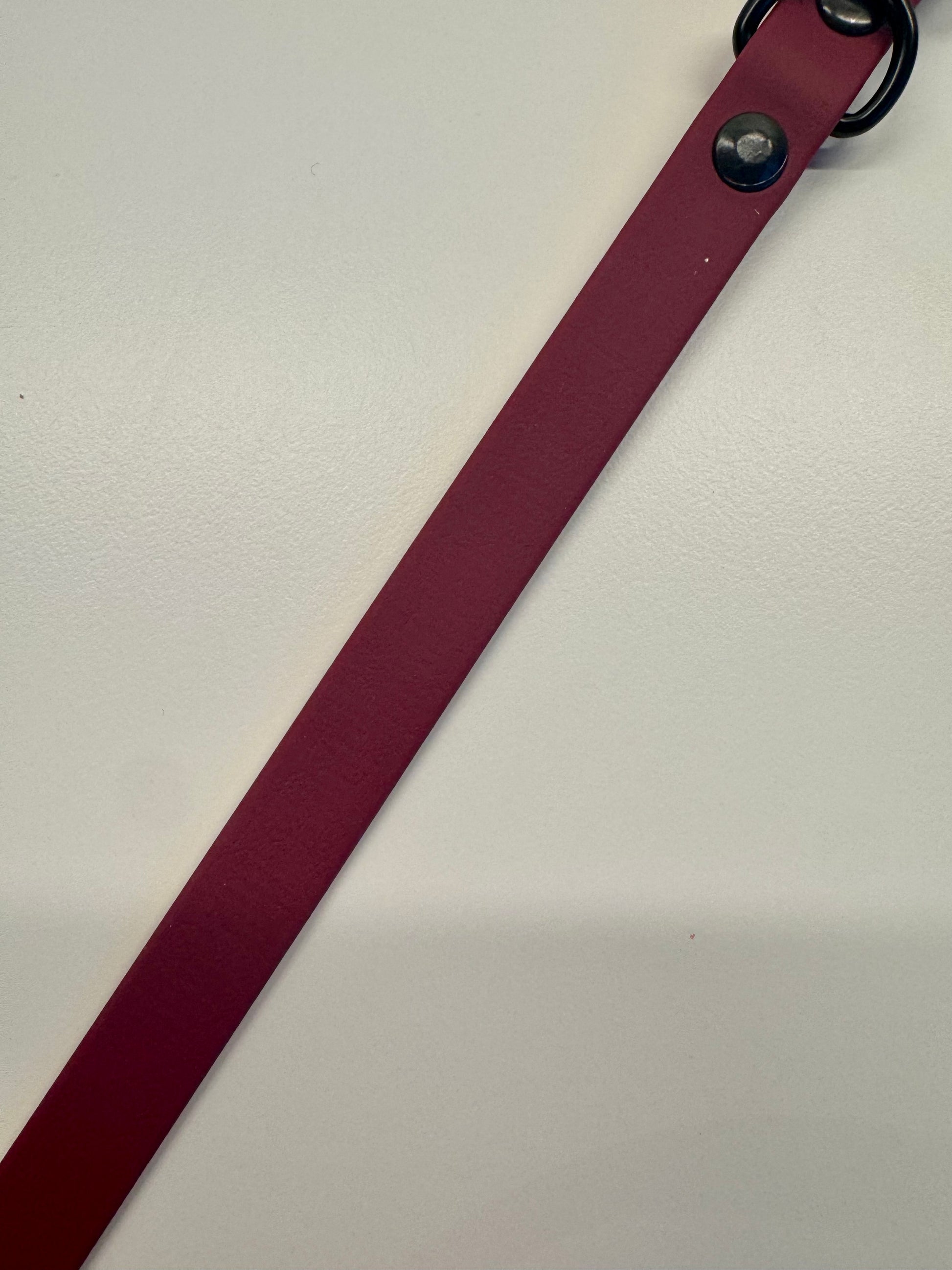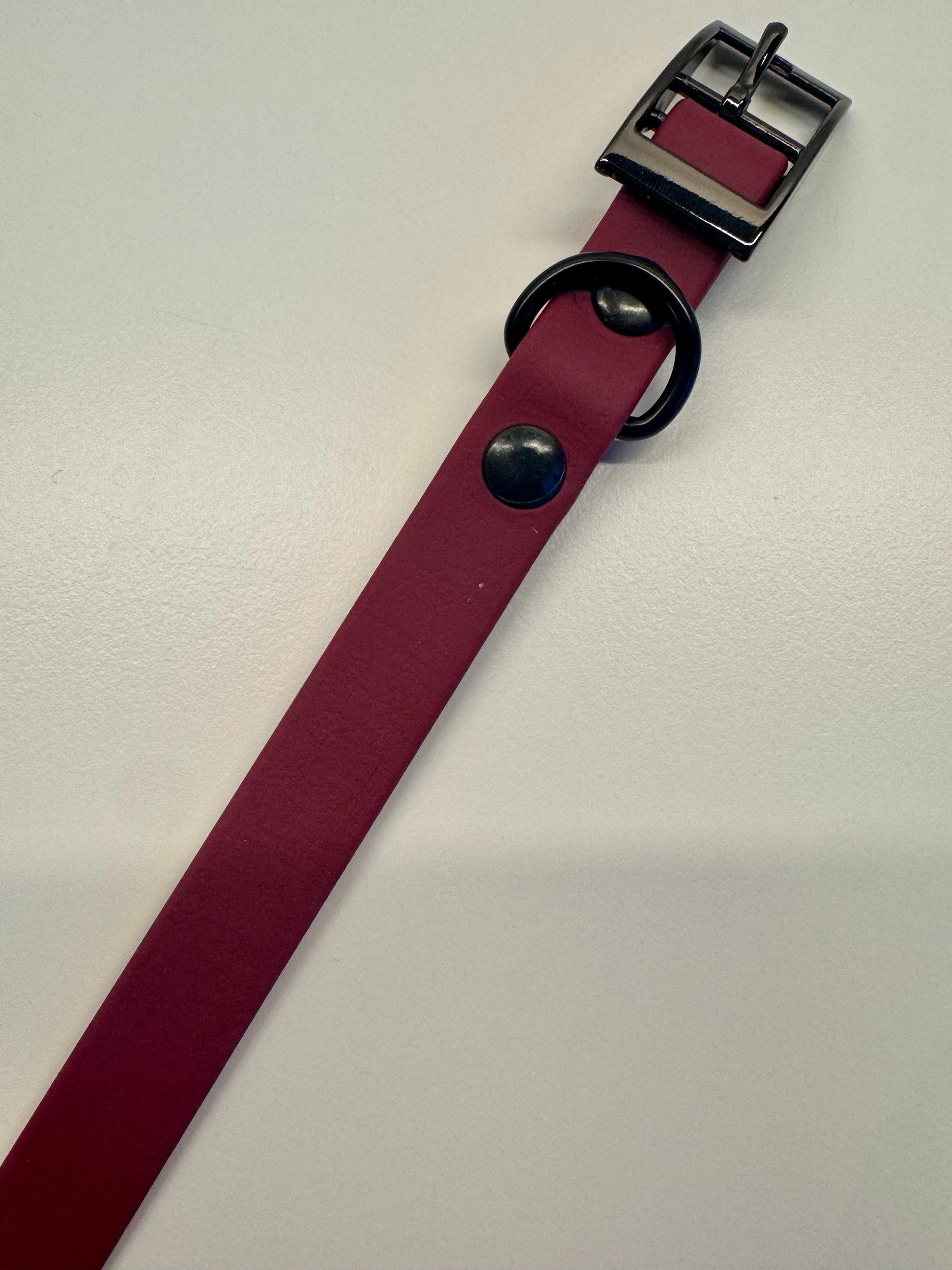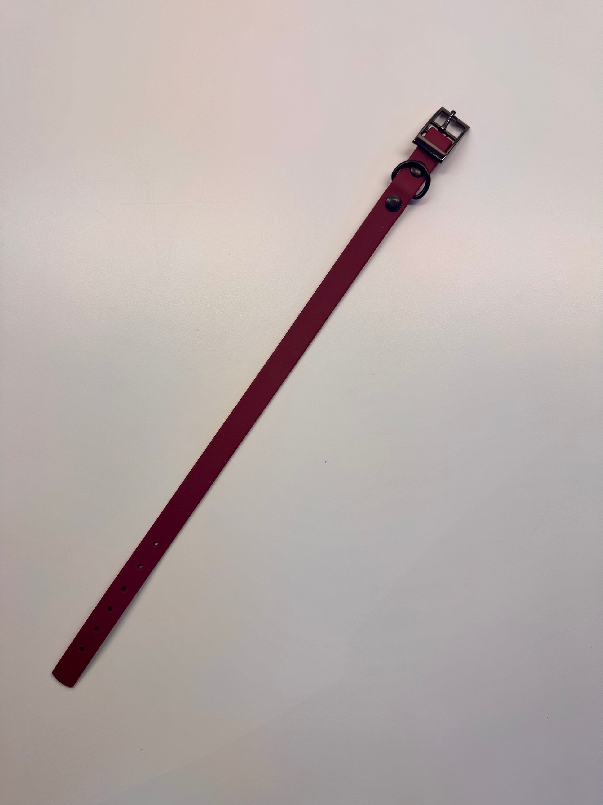 Op zoek naar een elegante en simpele hondenhalsband die opvalt? Deze handgemaakte Biothane halsband is een echte blikvanger voor jouw viervoeter. Gemaakt van hoogwaardig, soepel Biothane in een stijlvolle bordeaux rood afgewerkt met luxe details voor een exclusieve uitstraling.