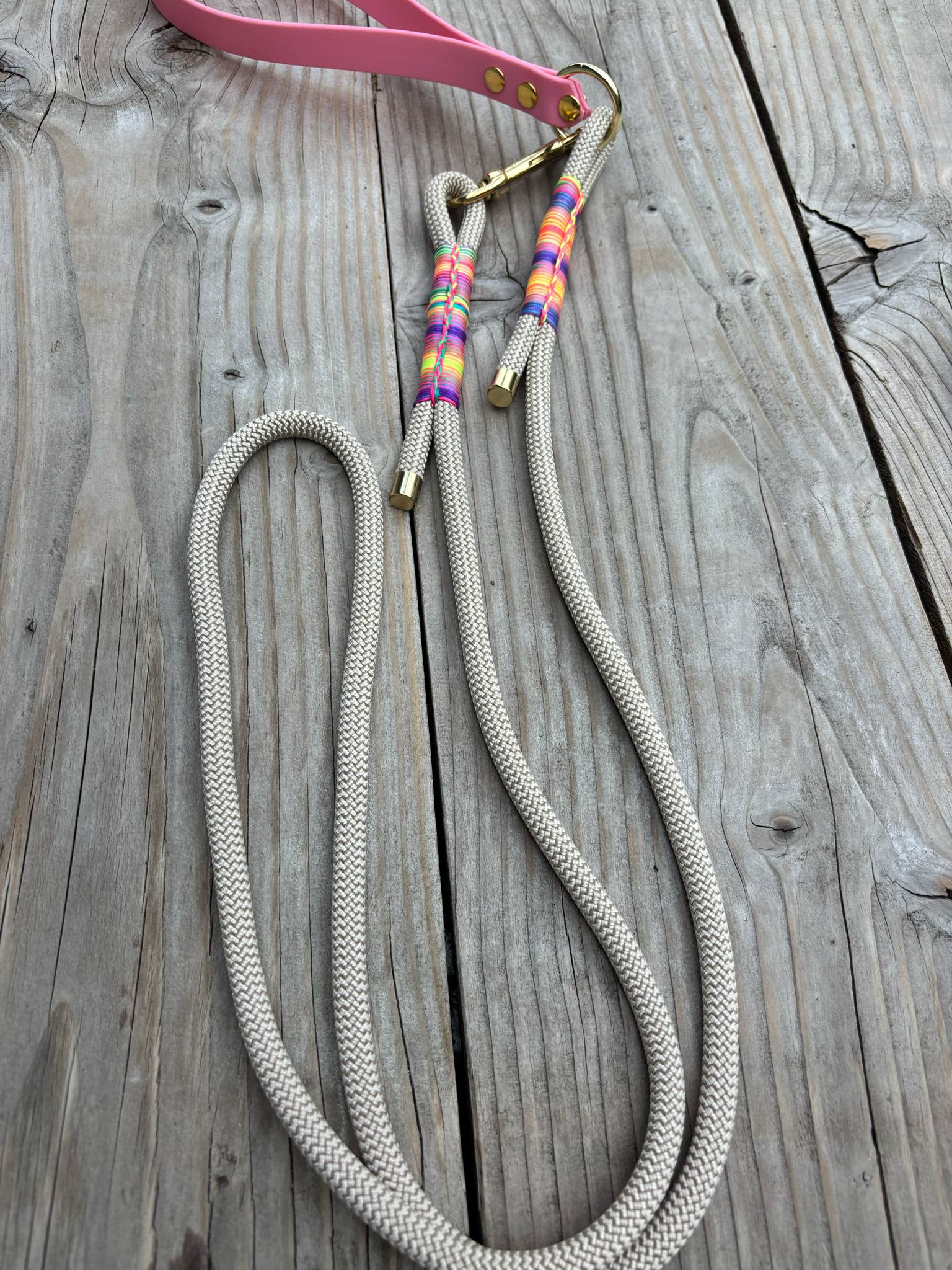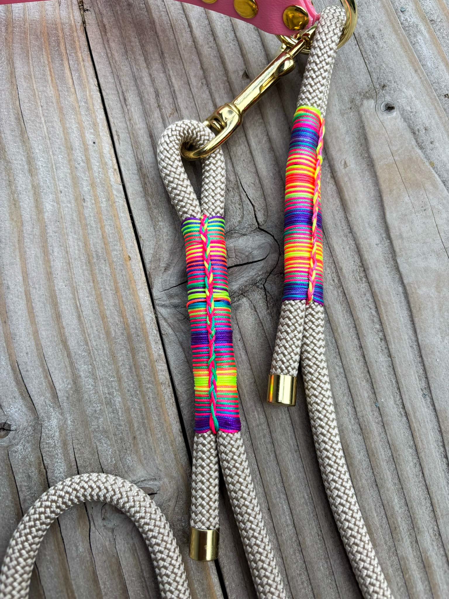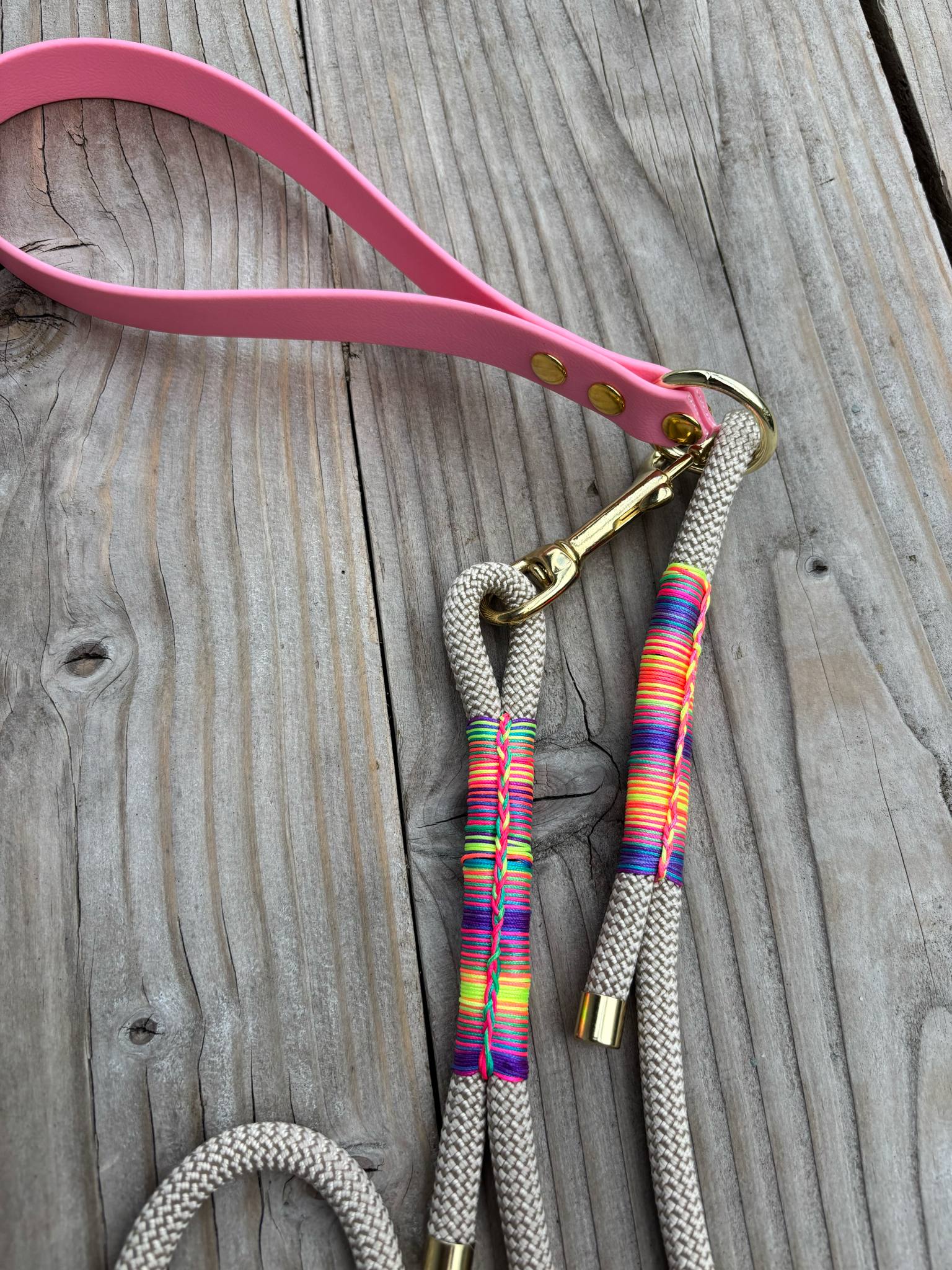 “Kleurrijk, stevig en met liefde met de hand gemaakt – deze lijn is dé eyecatcher tijdens elke wandeling! Gemaakt van sterk touw met regenboog details, goudkleurige accenten en een zachte Biothane handlus in bubblegum roze. Shop jouw unieke exemplaar!