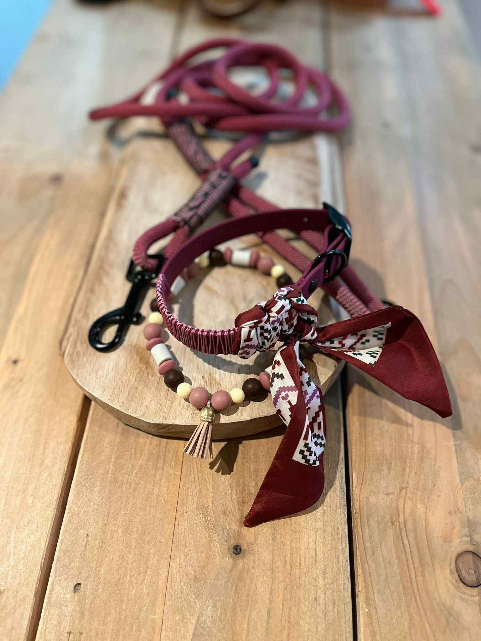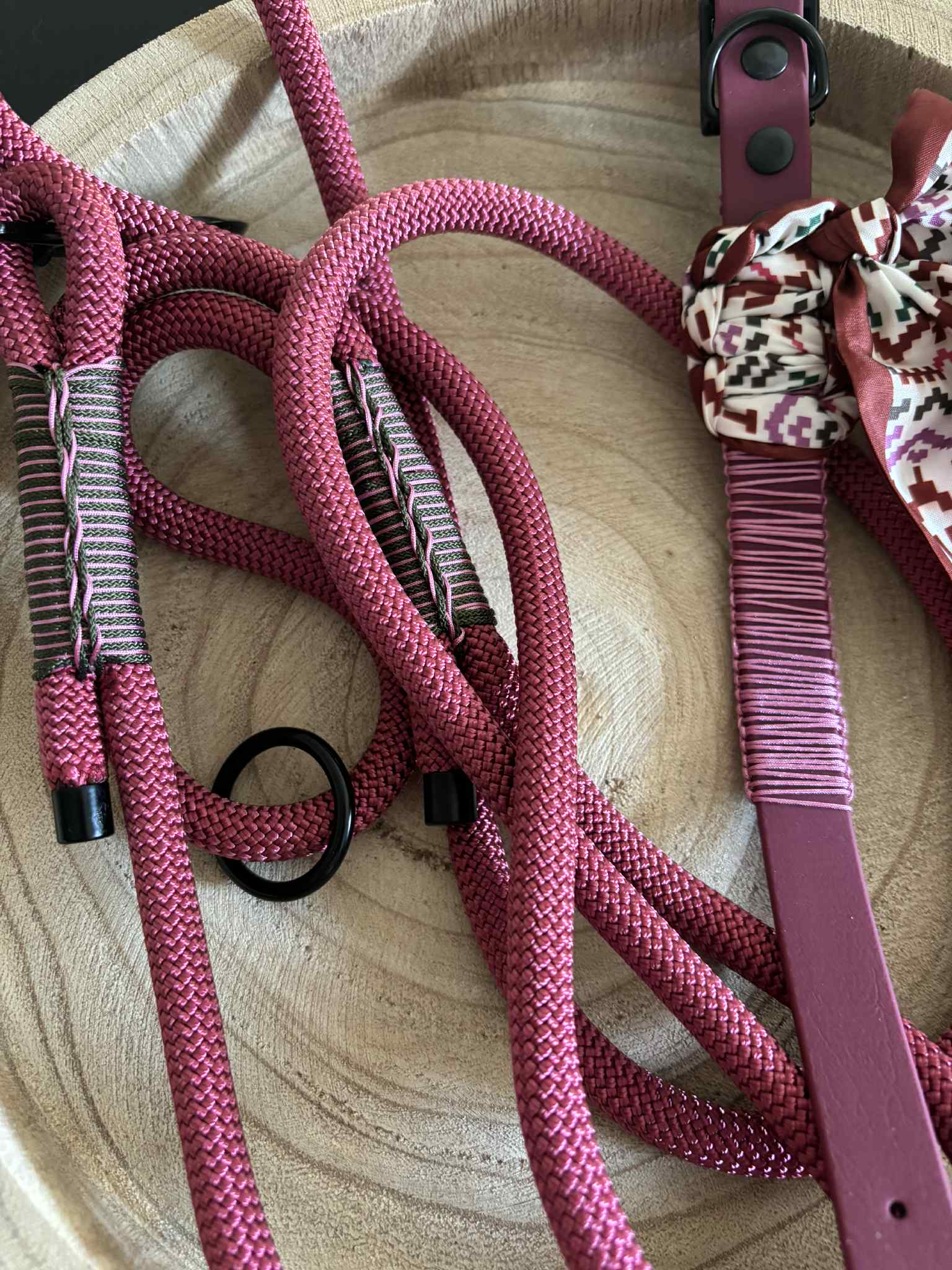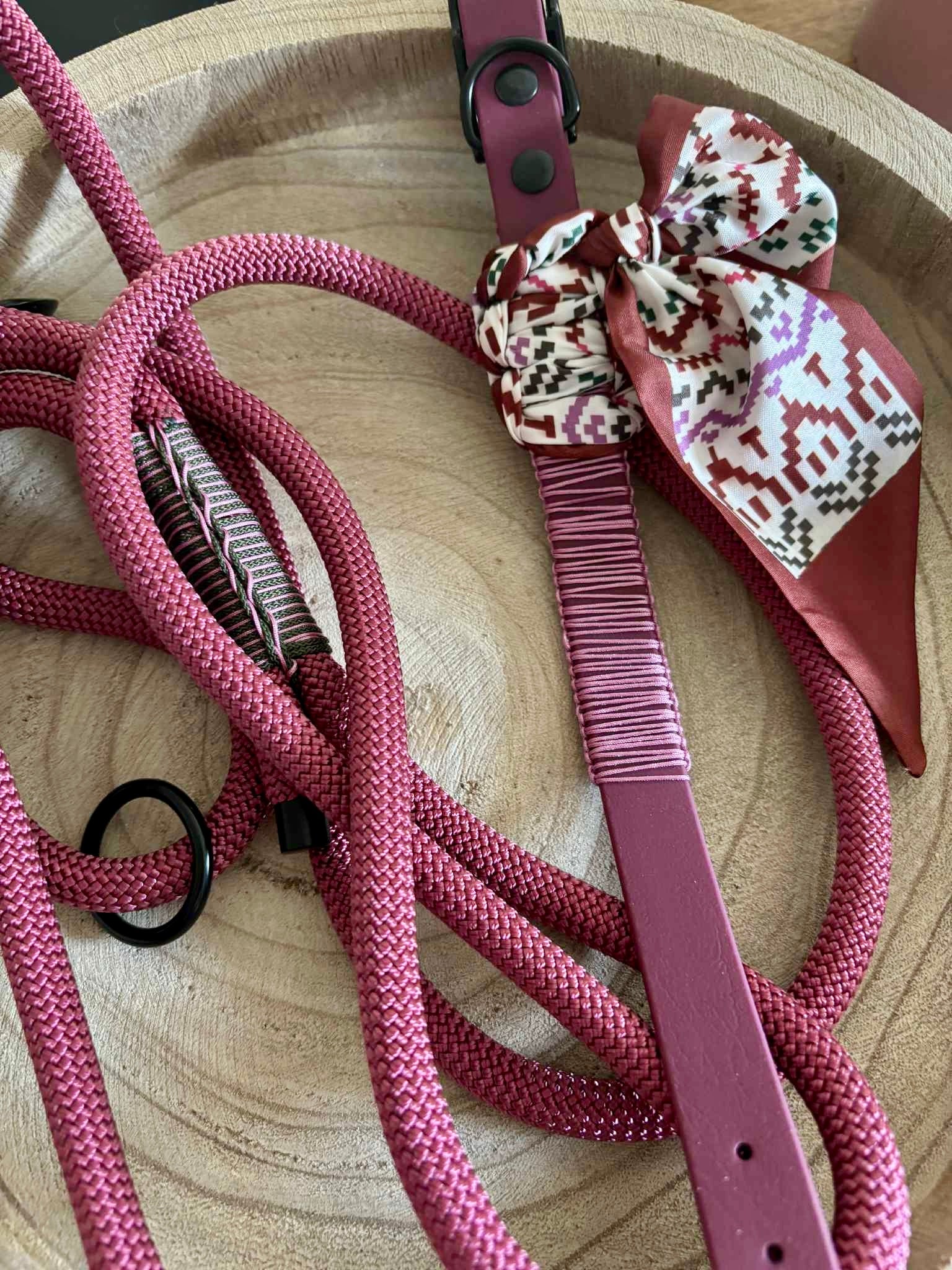 Ontdek de luxe van onze handgemaakte hondenriemen van hoogwaardige materialen. Deze prachtige hondenriem in oud roze is perfect voor baasjes die houden van kwaliteit en stijl. Dankzij het stevige touw en de elegante details zoals de decoratieve wikkeling en zijden accent, is deze riem niet alleen praktisch maar ook een echte eyecatcher tijdens iedere wandeling.