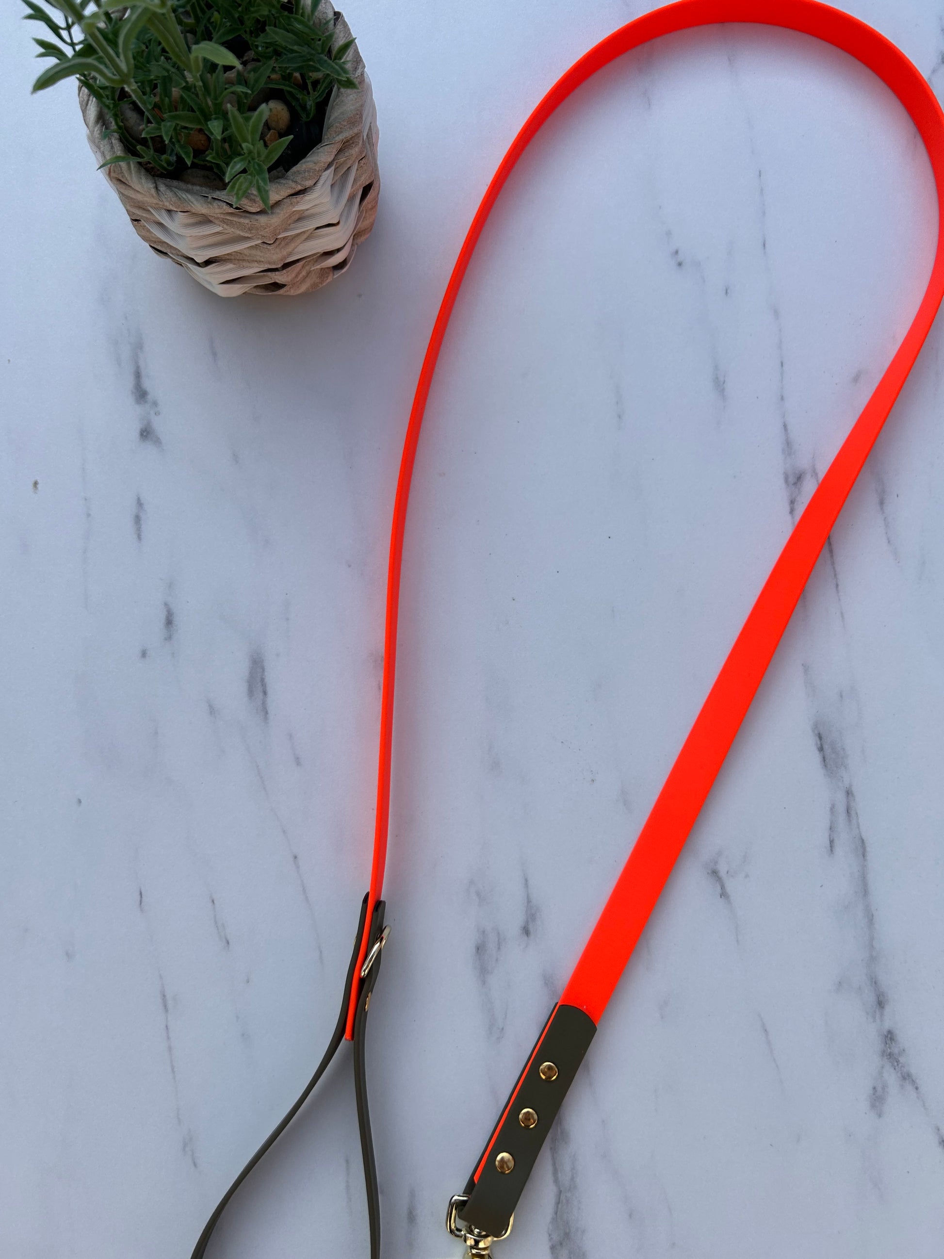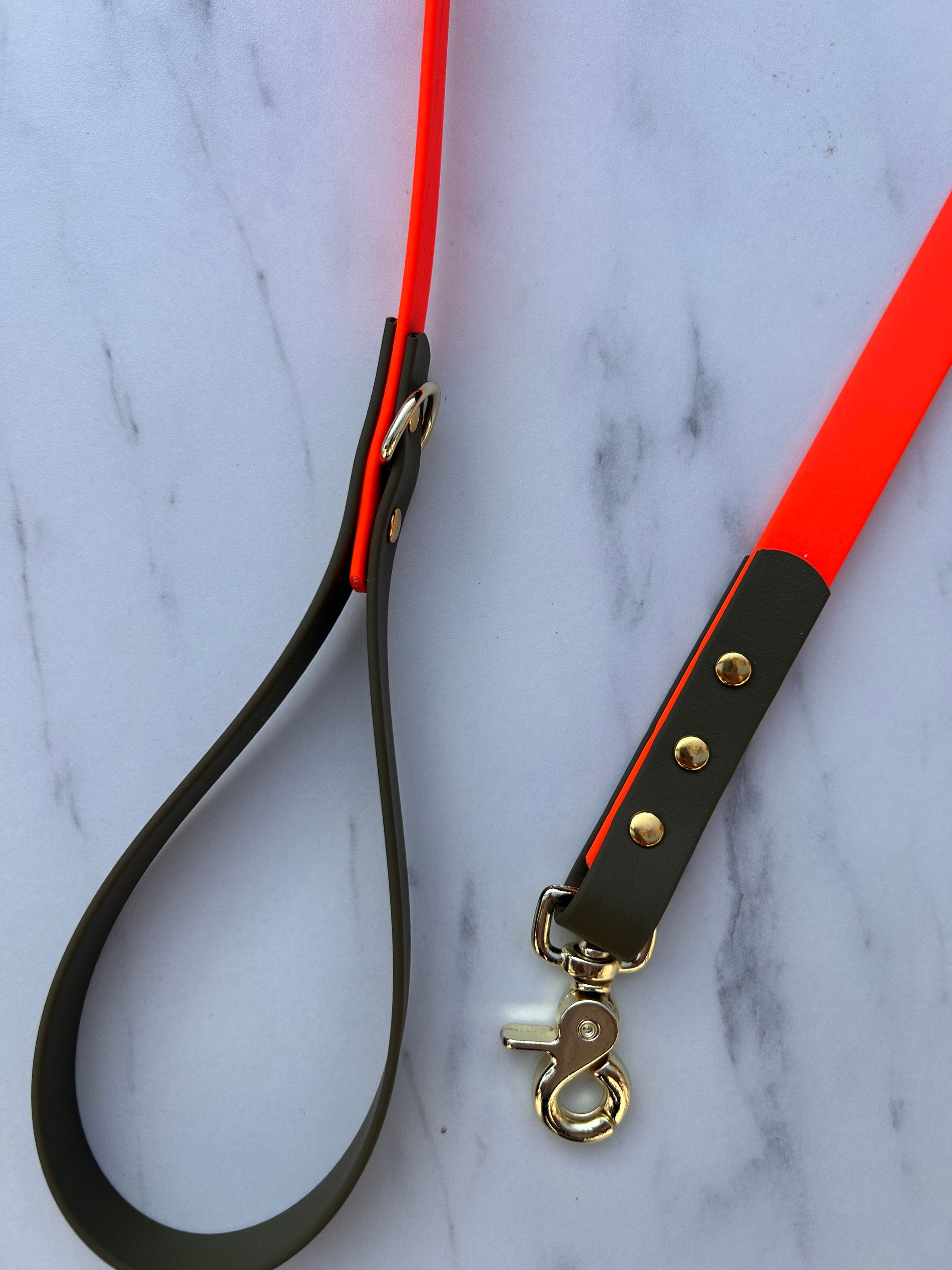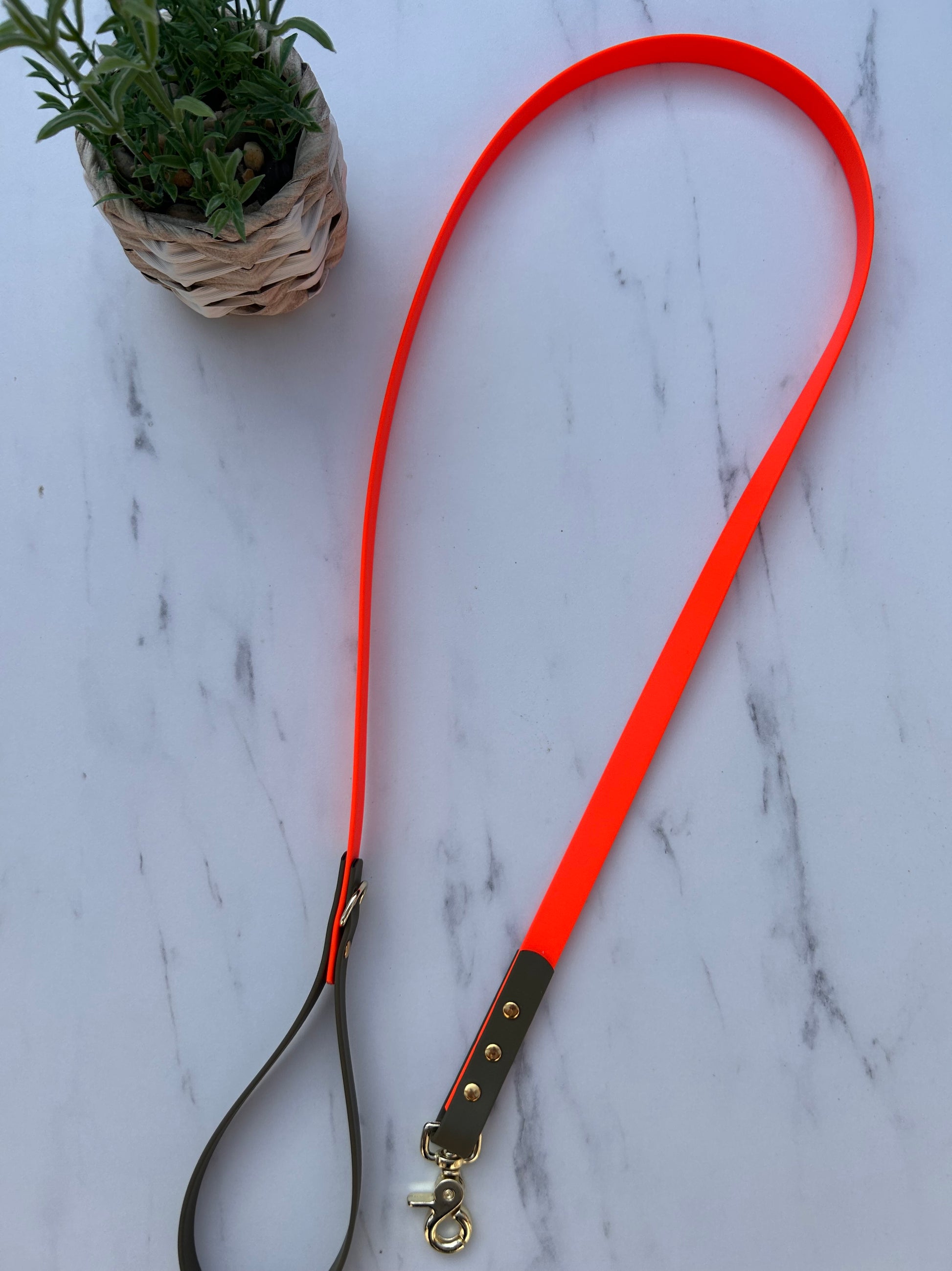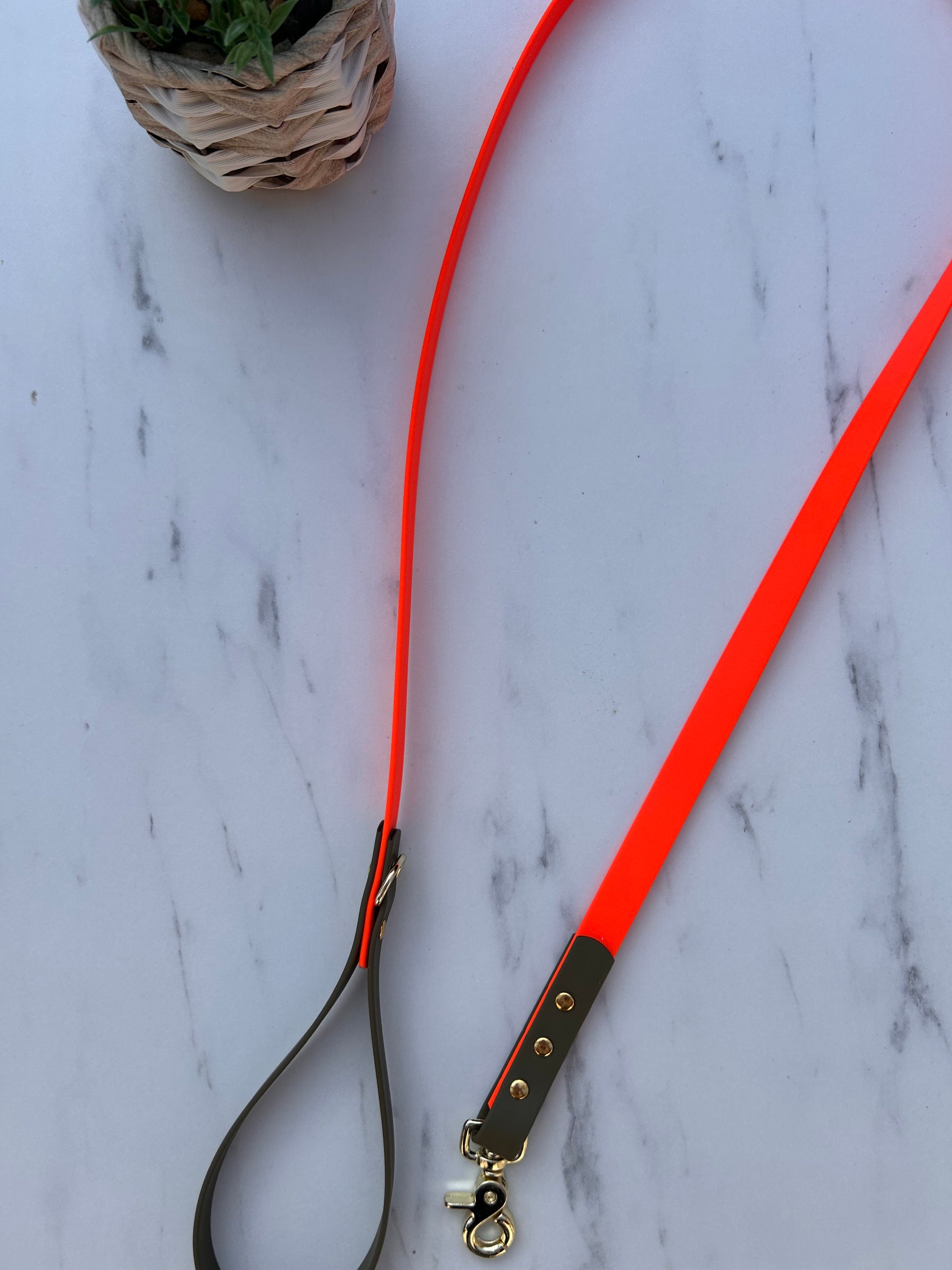 Stevige en kleurrijke riem in kaki en fluo oranje, gemaakt van soepel en geurvrij Biothane. Waterbestendig, makkelijk schoon te maken en perfect voor elk avontuur. Afgewerkt met zilverkleurig beslag en een comfortabele handlus.